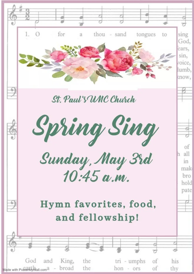 Community Connection - Spring Sing After Church Sunday, May 3, 2026 10:45 AM 12:00 PM 10:45 12:00 St. Paul's United Methodist Church 201 S. Monroe St. Monroe, MI 48161 United States (map) Google Calendar ICS Join us after church on May 3rd for a Spring Sing. Make a list of your favorite hymns, and come enjoy food and fellowship.